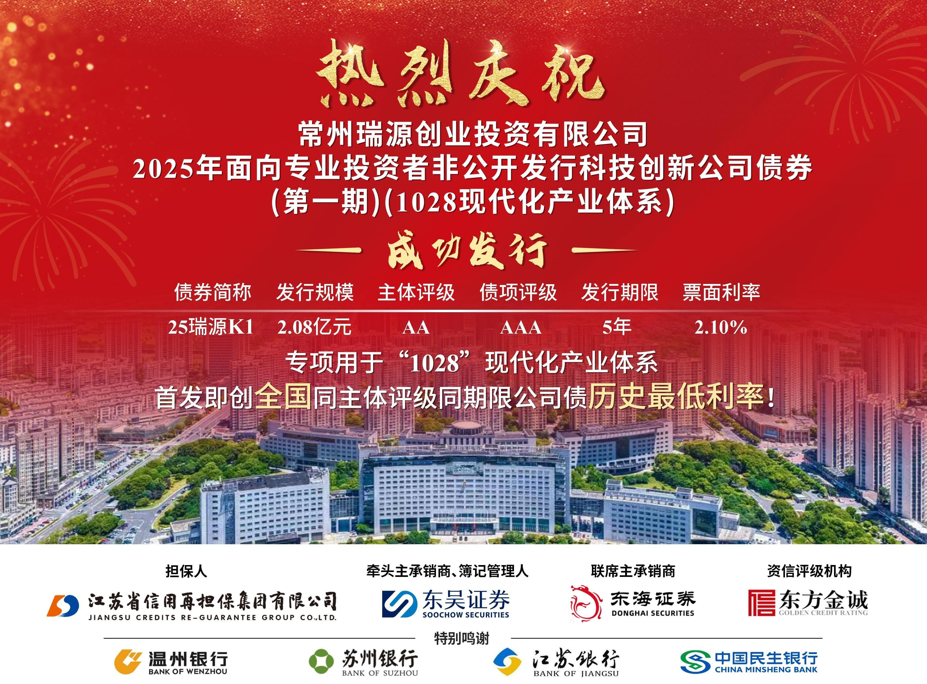 8月7日,常州瑞源創業投資有限公司科技創新債券在上海證券交易所成功發行,票面利率2.1%,首發即創全國AA級主體5年期公司債券歷史最低水平,充分體現市場對集團擔保增信價值的認可。本期債券是債券市場“科技板”上線以來,集團增信的首筆科創債,專項用于支持“1028”現代化產業體系。