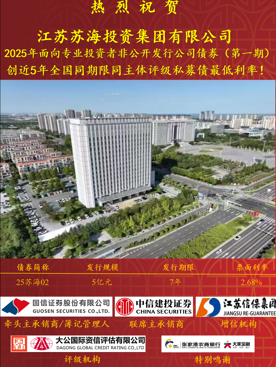 近日,由集團增信的江蘇蘇海投資集團有限公司(以下簡稱“蘇海集團”)5億元私募公司債券成功簿記發行,期限7年,票面利率2.68%,認購倍數3.44倍,創近五年全國AA+主體同期限私募債最低利率紀錄。中標資金約九成來自保險、券商資管等非銀機構,充分體現了投資人對集團擔保增信長期限債券價值的認可。