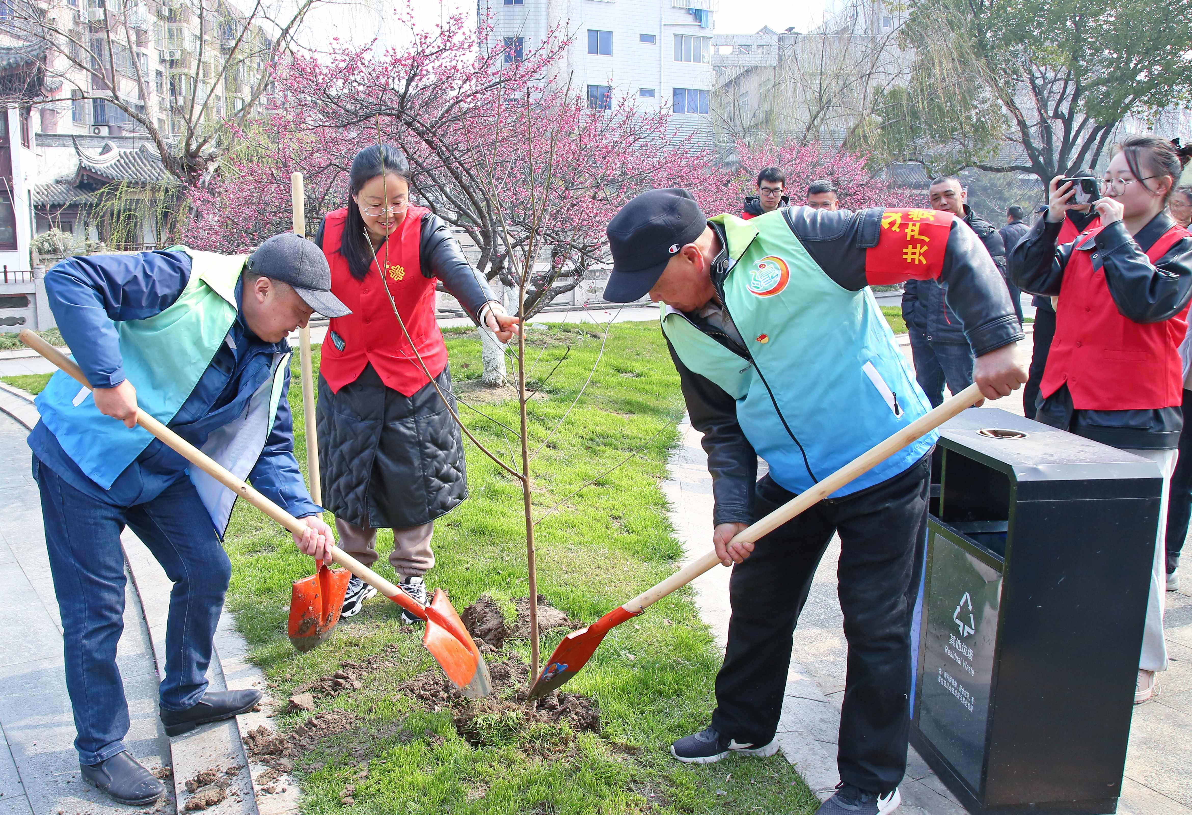 活動中,大家熱情洋溢、干勁十足。扶苗固根、揮鍬填土、提水澆灌……一番辛勤勞動后,一株株新種下的桃木、桂花樹在游園內、河道邊“安家落戶”,為春光明媚的三月增添一抹綠意,在微風中煥發出勃勃生機。