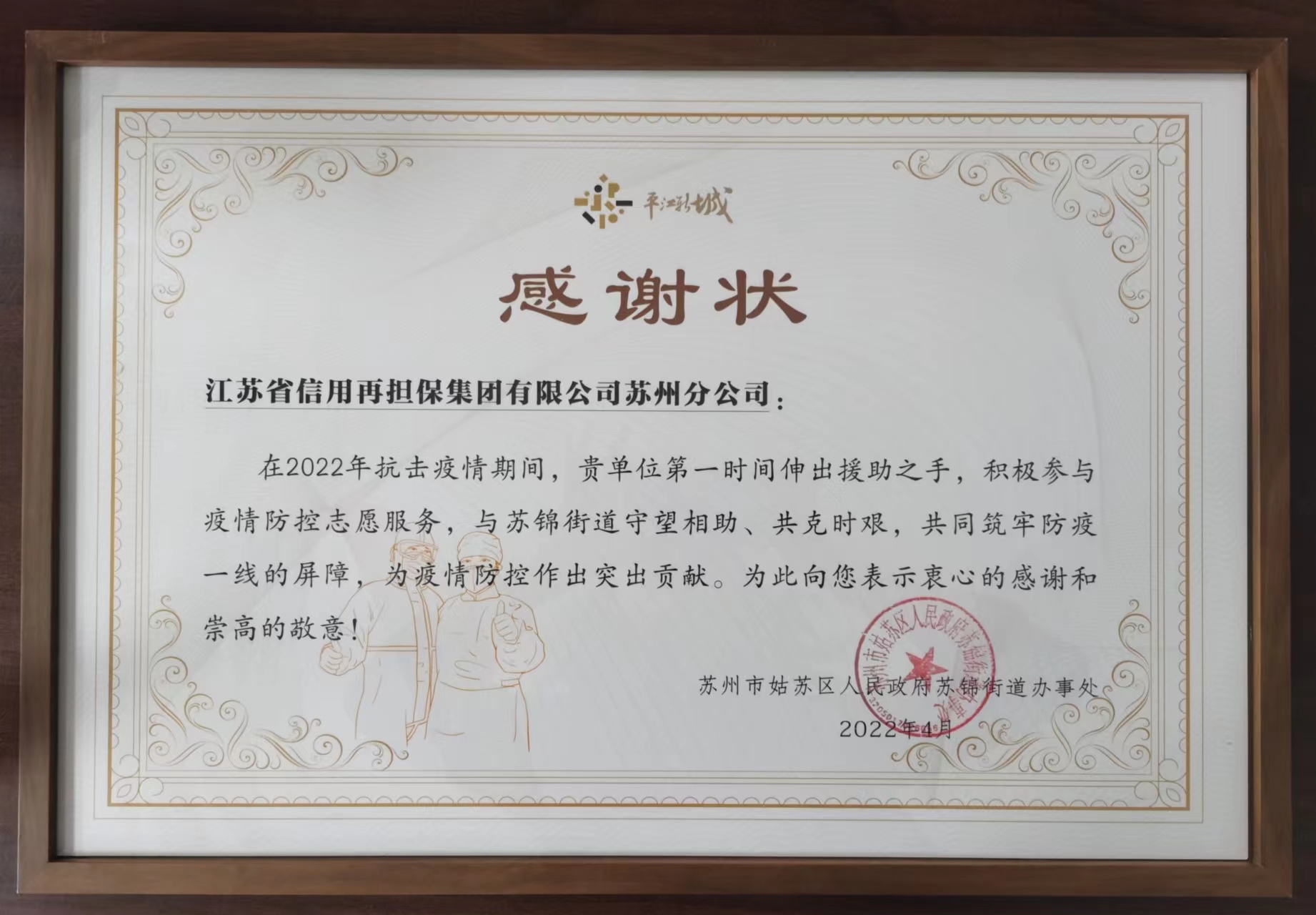 近日,蘇州分公司收到了來自蘇州市姑蘇區人民政府蘇錦街道辦事處送來的感謝狀,對公司組織志愿者參加街道疫情防控工作表示了充分肯定。