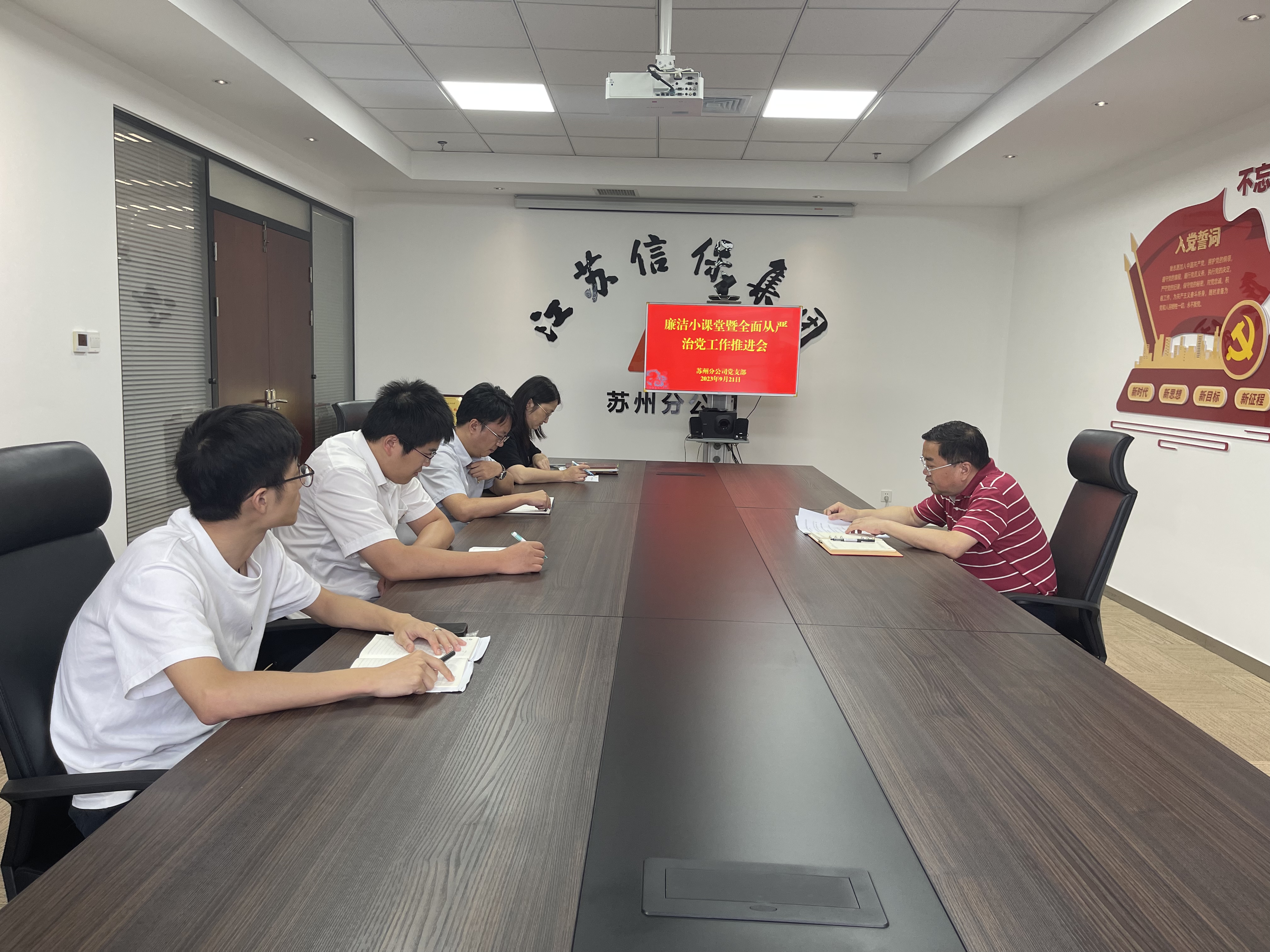 9月21日,蘇州分公司黨支部組織開展廉潔小課堂暨全面從嚴治黨工作推進會,全體黨員參會。