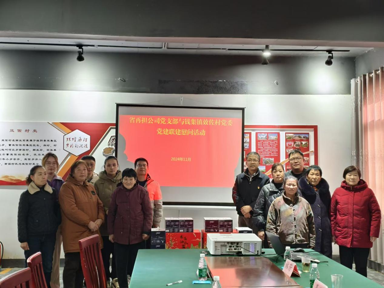 為進一步助力鄉村振興工作,弘揚社會主義核心價值觀,踐行國企的社會責任,11月27日,省再擔公司黨支部組織黨員代表赴沭陽縣錢集鎮效佐村開展黨建聯建活動,并為生活困難村民送去米面糧油等慰問品。